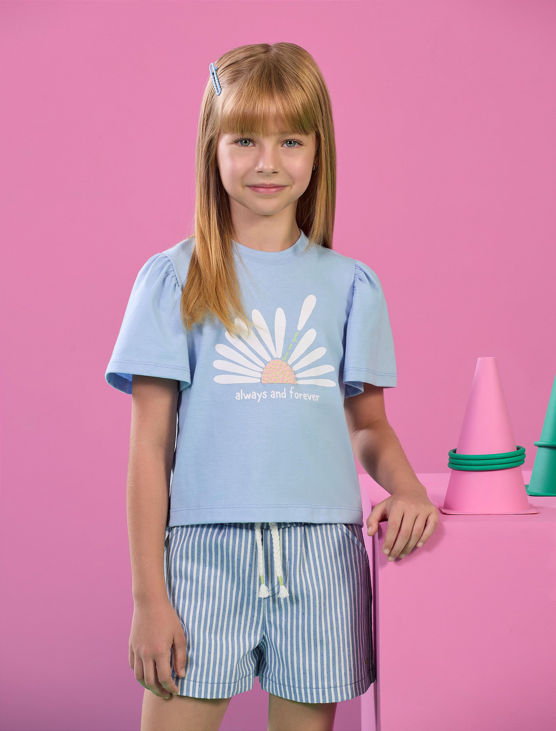 Composto por blusa em algodão macio, possui estampa emborrachada charmosa e mangas princesa que trazem um toque romântico e moderno à peça. O short em sarja listrada complementa o look com muito estilo, acabamento impecável e detalhes lindos que fazem toda a diferença.