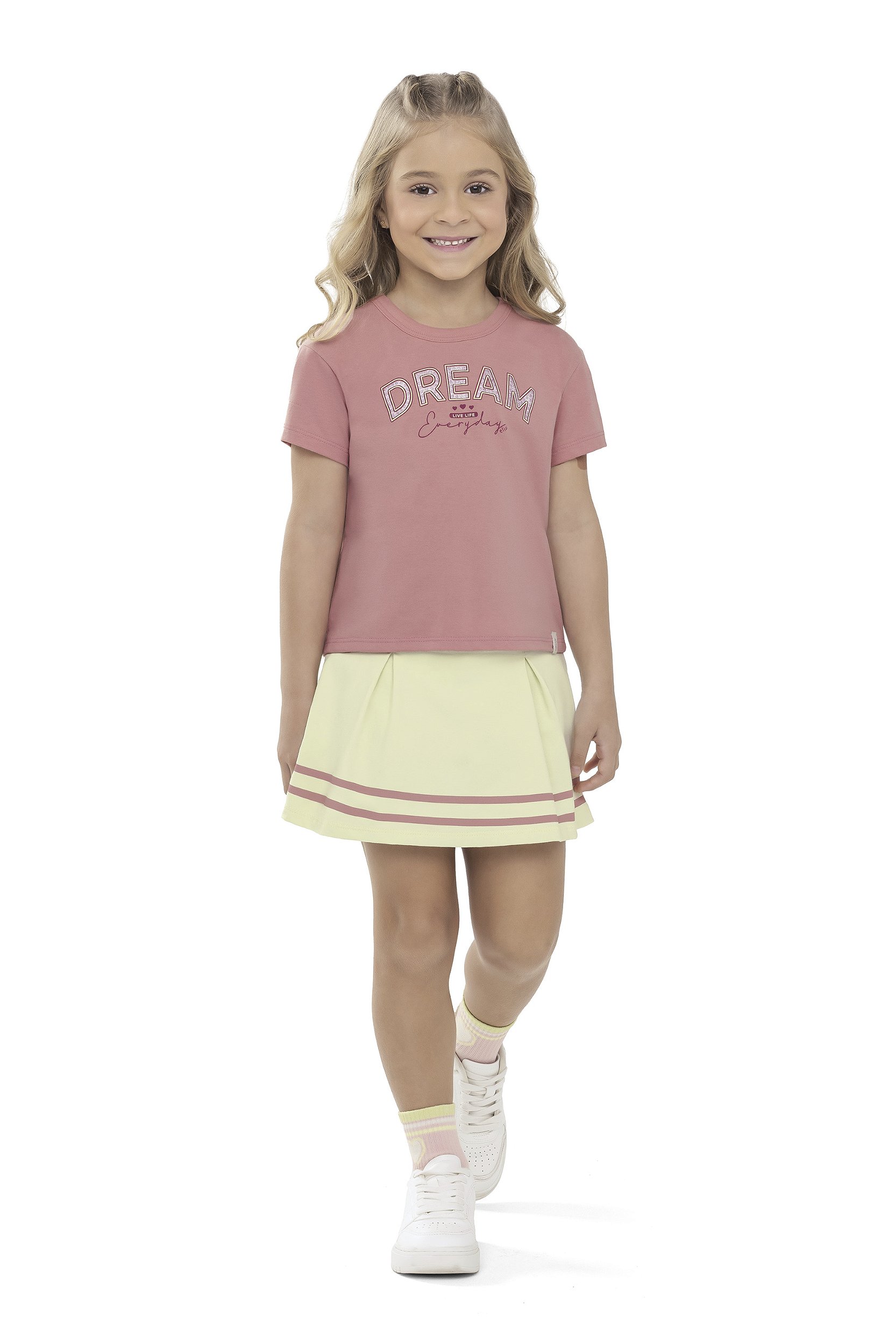 A saia short com pregas completa o look com praticidade e segurança, permitindo brincar, correr e se movimentar com total conforto, sem abrir mão do estilo.