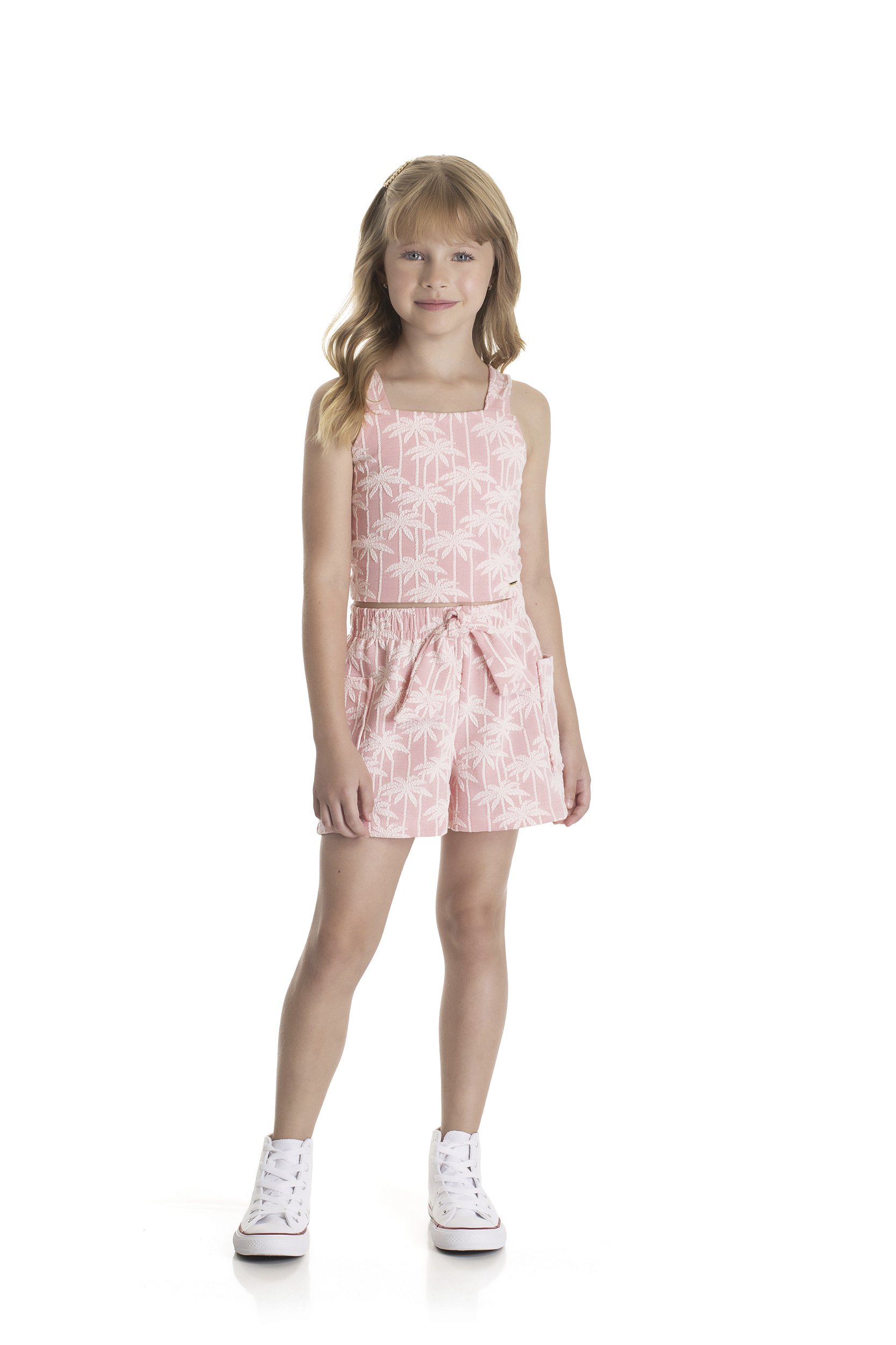 Composto por cropped e short confeccionados em tecido bordado, possui toque macio, respirável e extremamente fresquinho, garantindo liberdade total para brincar, correr e se movimentar com conforto ao longo do dia.