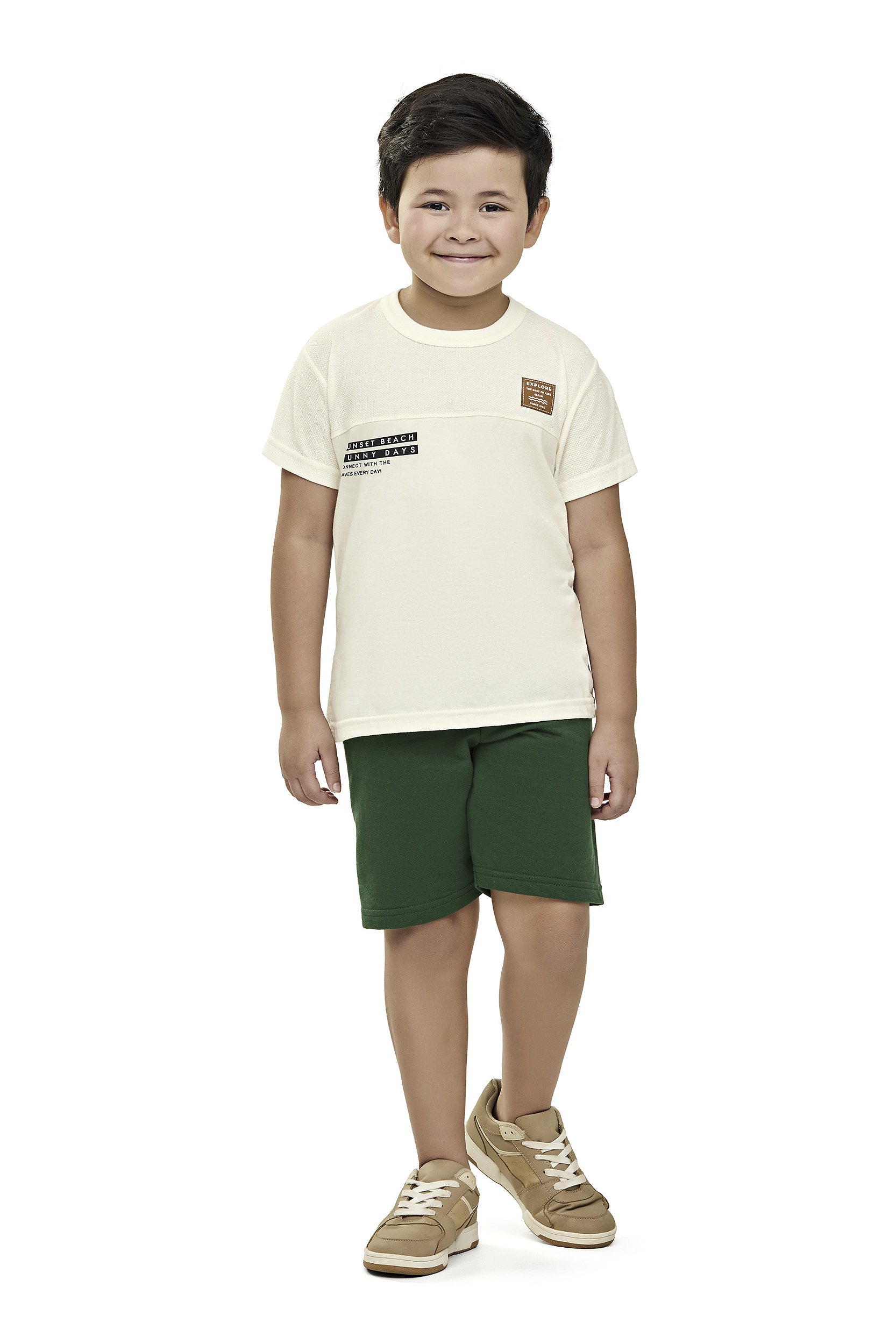 Conjunto masculino infantil que une estilo e conforto em uma proposta super versátil. A camiseta traz um charme extra com a mistura de texturas no tecido, deixando a peça moderna e diferenciada, perfeita para quem gosta de um toque especial no visual. Já o short em tom verde profundo completa o look com praticidade e caimento impecável. O resultado é um conjunto arrumadinho, ideal para ocasiões especiais, sem abrir mão do conforto que as crianças precisam. Uma escolha que combina sofisticação e praticidade no dia a dia.